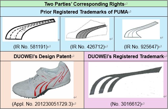 This case involves a design patent for a product called "Spike Shoes" (hereinafter referred to as "the patent"), registered by Jiangsu Duowei Sports Goods Co., LTD. (hereinafter referred to as "DUOWEI"). The world-renowned sportswear company PUMA SE (hereinafter referred to as "PUMA") discovered that the linear pattern on the shoe's upper (hereinafter referred to as "the disputed pattern") was very similar to the device trademark which PUMA had long used and held prior trademark right to. PUMA stressed that the exploitation of the patent could easily confuse the consumers and requested the China National Intellectual Property Administration (CNIPA) for invalidation of the patent. The two parties corresponding rights are listed below.